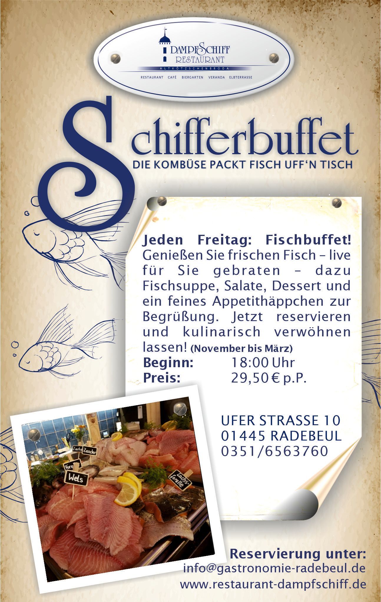 Freitags kommt der Fisch auf den Tisch. Wöchentlich bieten wir Ihnen ein frisches Fischbuffet. Ab 18 Uhr können Sie schlemmen bis die Kombüse raucht.